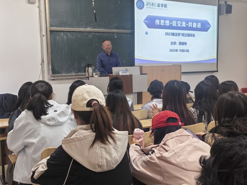 为深入贯彻落实学校领导联系班级制度,搭建领导与青年学子思想交流的桥梁,强化对青年学生的成长引领与价值塑造,10月24日下午,学校正处级统战联络专员郭建伟同志走进法学院 2023 级法学 1 班,以“传思想、促交流、共奋进”为主题开展专题班会,围绕“业”之核心,为同学们精准锚定成长坐标。