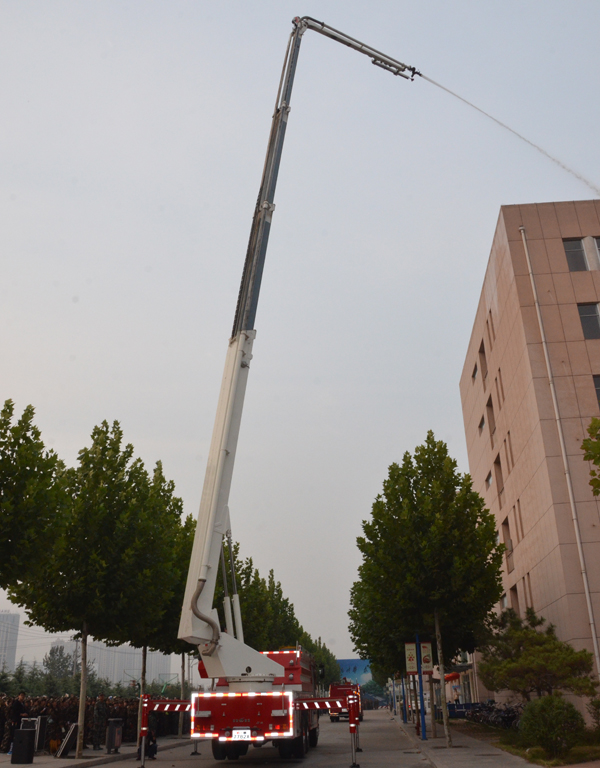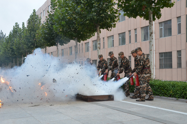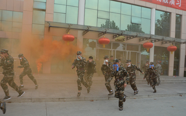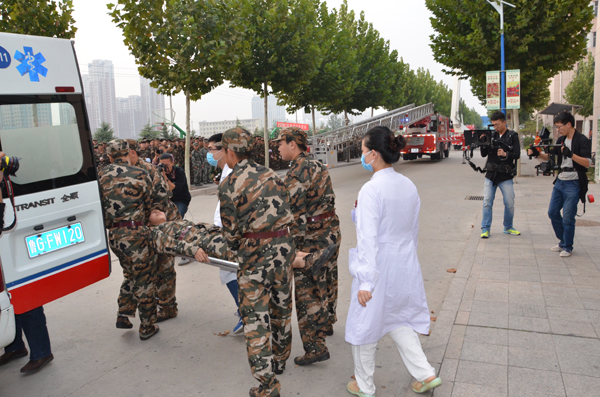 16:30演习各项工作准备就绪,现场指挥员向演习总指挥报告后,演习总指挥王清明命令:“潍坊学院2016级新生应急疏散演习开始!”消防值班室值班员立即开启应急疏散警报,学生公寓值班员按照应急疏散预案的要求,切断应急门的主电源,开启全部疏散通道,指挥被困学生用湿毛巾捂住口鼻分别从安全出口和一楼的“应急窗”有序疏散,并同时向校保卫处和“119”报警。学校保卫处工作人员接到报警后,携带灭火器,迅速赶赴火场救援。“119”指挥员到达现场了解情况后,立即进行铺设消防带灭火、高空灭火、云梯救人等措施。120急救车在引导人员的引导下,到达火灾现场,对伤员实施紧急救护。被困学生在工作人员组织的自救和消防队员的帮助下,全部疏散到楼外的安全地带。随后,2016级新生进行了灭火实战汇报表演。