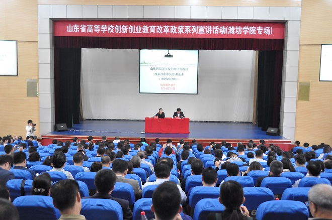 山东省高等学校创新创业教育改革政策系列宣讲活动(潍坊学院专场)于2016年10月18日下午两点在潍坊学院图书馆报告厅顺利举办。来自潍坊和淄博地区各高校的创新创业教育改革领导小组成员,教学、学生、人事、 就业、团委、创新创业学院等相关部门负责同志,二级学院分管负责同志及创新创业教育指导教师代表等共计480人参会。潍坊学院副校长王清明同志主持此次宣讲活动。