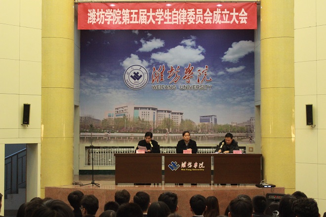 2016年11月23日下午,潍坊学院第五届大学生自律委员会成立大会在行政楼一楼报告厅举行。出席这次大会的有学生工作处处长李学军,学生工作处副处长张付功,学生管理科科长朱万山主持本次会议。