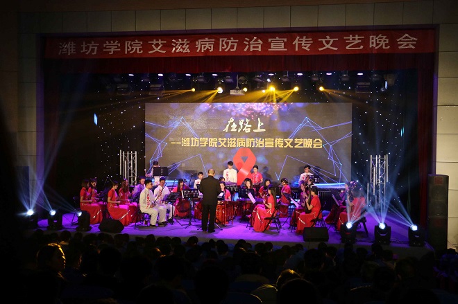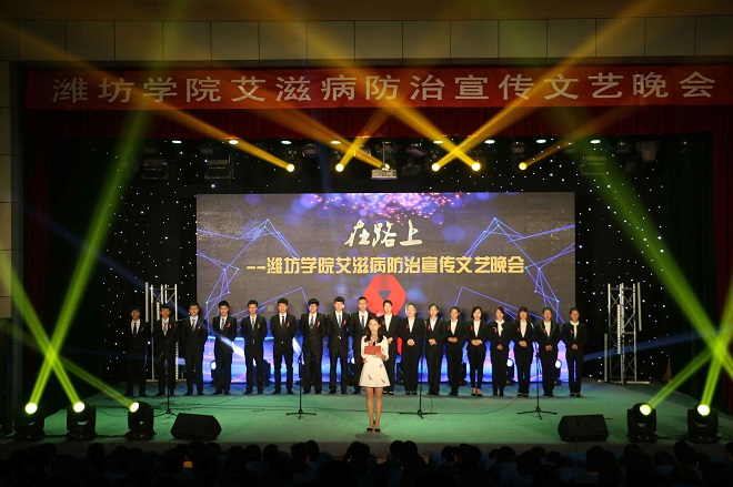 为呼吁青年大学生加强对艾滋病的认识,提高自我保护意识,减少艾滋病罹患率,11月30日晚,“在路上——潍坊学院艾滋病防治宣传文艺晚会”在图书馆报告厅隆重举行。潍坊市疾病预防控制中心党委书记韩辅廉、潍坊高新区党工委管委会副主任张龙江、我校副校长王清明、王旭升及潍坊高新区卫生和计划生育局局长刘翠萍、潍坊高新区卫生和计划生育局党总支书记葛丽出席,学生工作处、总务处、校医院负责同志,部分二级学院领导、老师与学生宣讲员一起观看了演出。