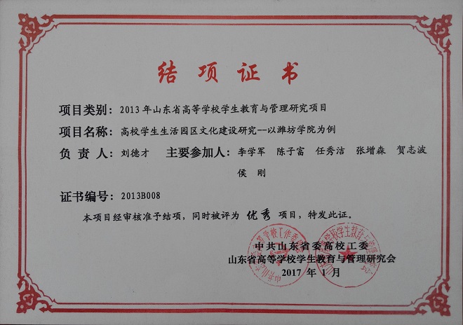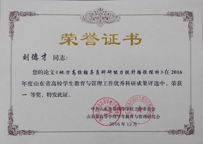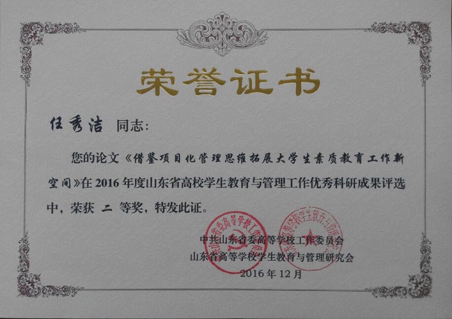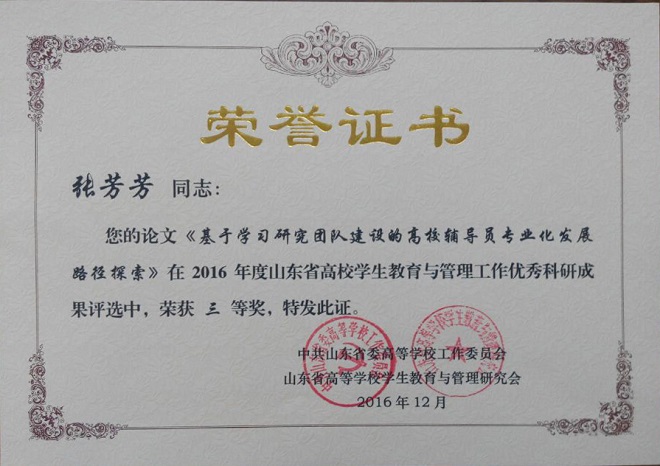 会上,中国矿业大学学生工作处处长黄军利,华中师范大学学生工作部部长、人武部部长刘宏达分别就“新时期高校辅导员队伍建设的实践与思考”和“以信息化推进高校学生工作创新”作了经验介绍。中国海洋大学等6所省内高校作大会交流发言。与会代表分别就“完善全员全过程全方位育人机制”、“增强大学生思想政治教育实效性”、“推进以文化人以文育人”、“强化思想价值引领,服务学生全面发展和成长成才”、“推动培育和践行社会主义核心价值观长效机制建设”、“学生日常教育管理服务工作创新”进行了分组讨论。大会表彰了2016年度全省高校学生教育与管理工作优秀科研成果、山东省高等学校学生教育与管理研究项目优秀成果,我校弘德书院副院长刘德才、计算机工程学院党总支副书记任秀洁、物理与光电工程学院学生工作办公室主任张芳芳的论文分获一、二、三等奖,弘德书院副院长刘德才的研究项目被评为优秀项目。