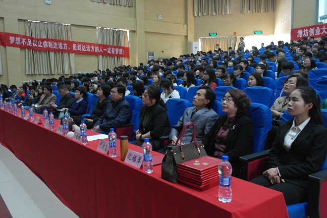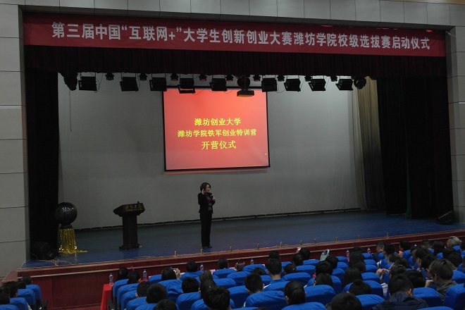 4月25日下午,第三届中国“互联网+”创新创业大赛校内选拔赛启动仪式暨潍坊创业大学潍坊学院铁军创业特训营开营仪式在图书馆报告厅顺利举行。该项活动由我校学生工作处大学生创新创业教育管理中心与潍坊创业大学联合举办,旨在对我校参加第三届中国“互联网+”创新创业大赛的相关工作作出全面部署,激发同学们创业梦想和创新创业热情,提高同学们的积极参与意识。
