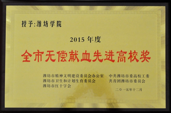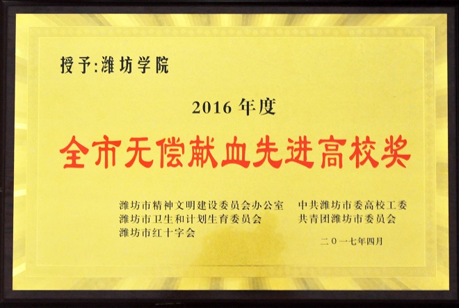 5月3日,潍坊市高校无偿献血工作会议在市政服务中心举行。会上,通报表彰了2015年、2016年全市高校无偿献血工作先进集体和先进个人,我校荣获2015年度、2016年度全市无偿献血先进高校,王伦刚、刘德才、华德臣、郎斌、边洪燕、葛红丽、沈杰等获“2015年度、2016年度全市高校无偿献血工作先进个人”称号,张英祥、宫华运、孙志鹏、付新、殷潇等56名学生获“2015年度、2016年度全市高校无偿献血志愿服务先进个人”称号,杨培晔、郭连栋等636名学生获“2015年度、2016年度全市无偿献血爱心大学生”称号,学校弘德服务队获“2015年度全市高校无偿献血志愿服务先进集体”称号、学校大学生红十字协会连获“2015、2016年度全市高校无偿献血志愿服务先进集体”称号。