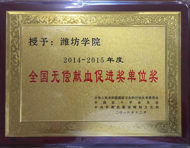 近日,国家卫生和计划生育委员会、中国红十字会总会、中央军委后勤保障部卫生局对全国无偿献血工作进行通报表彰,我校榜上有名,荣获2014—2015年度“全国无偿献血促进奖单位奖”。