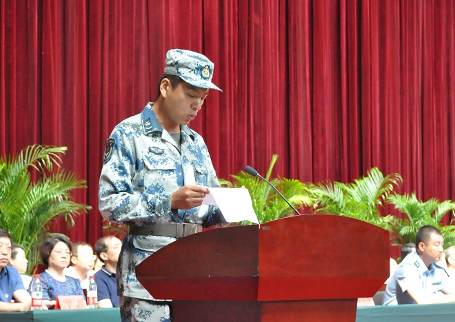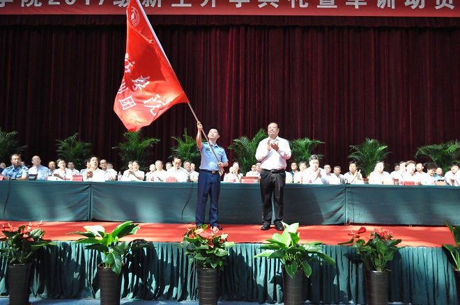 王清明宣读了《关于成立2017级新生军训团的决定》,隋少杰传达了军训计划,冯滨鲁向军训团授团旗。