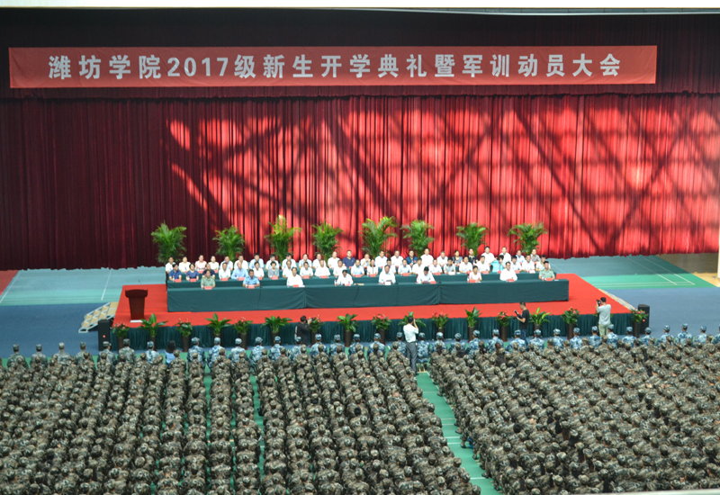 寒窗十年终圆梦,壮志豪情谱新篇,9月12日上午,潍坊学院2017级新生开学典礼暨军训动员大会在潍坊学院体育馆拉开了帷幕。出席本次动员大会的领导有潍坊学院校长冯滨鲁、党委委员副校长王清明、党委委员纪委书记马茜华、党委委员副校长朱猷武、党委委员副校长赵光强以及军训团团长隋少杰、军训团副团长和军训团政委学生工作处李学军处长,在主席台旁就坐的还有学校各部门各单位主要负责同志。体育场中座无虚席,2017级全体新生、军训团全体教官和新生辅导员共同参加此次军训动员大会,共享潍院荣耀,共担潍院责任。
