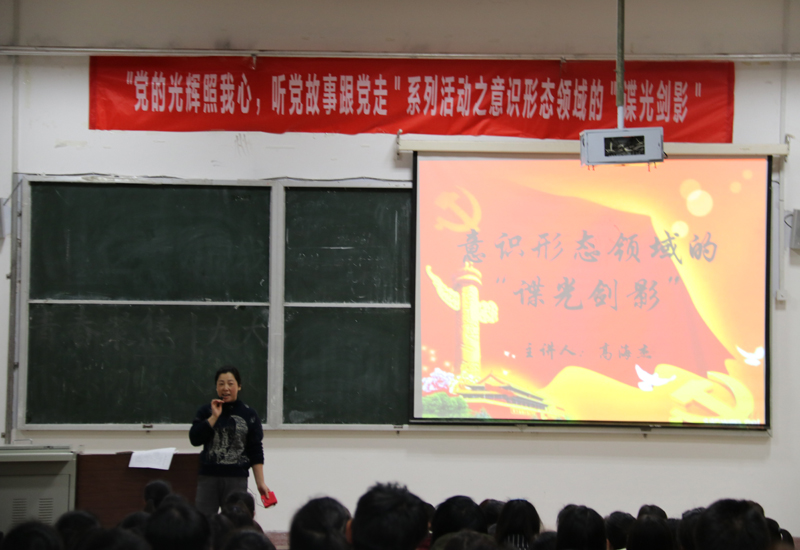 此次讲座以“党的光辉照我心,听党故事跟党走”为主题,给大家呈现了一场“意识形态里的刀光剑影”的视觉盛宴。会议内容从两个方面展开,一是全面把握思想政治领域的形态与形势,二是以创新精神推进高校思想政治教育工作的开展。高海杰老师提到,当下思想政治领域的发展呈现总体向上向好的态势,可意识形态这场没有硝烟的斗争却依旧激烈,各种国际思想文化交流日渐频繁,其领域斗争深刻复杂。国际上,随着中国日渐崛起,一些西方国家便把中国当作是意识形态领域的主要敌人,他们编造如“中国威胁论”“中国崩溃论”等无谓的言论企图动摇中国的意识形态,有甚者凭其强大的经济实力与前沿社科言论去推行他们自己的价值观与意识形态。而在国内,一些如“普世价值”“宪政民主”等错误思潮此起彼伏。在这样严峻的形势下,高校作为宣传马克思主义真理的文化阵地,做好其意识形态领域的工作显得尤为重要。