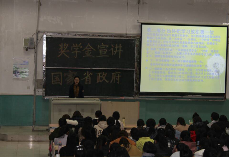三位优秀的奖学金获得者都大致在思想、生活、学习以及工作几个方面与大家交流了自己的心得体会,更为重要的是,她们都展示了自己两年来优异的专业学习成绩以及在各种比赛中获得的荣誉证书,让同学们大开眼界。本次“国家、省政府奖学金获得者走进外国语学院”宣讲活动圆满结束。