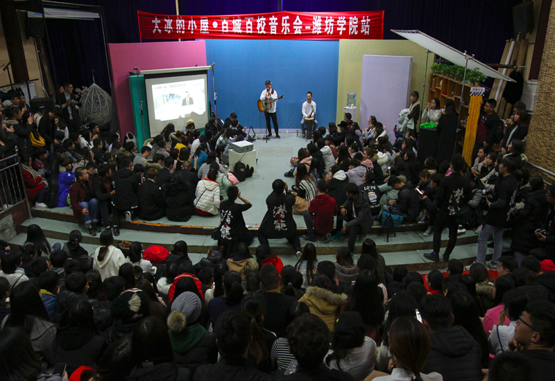 11月18日晚,由大冰的小屋主办,潍坊学院潜能影业与孝慈文化承办的“大冰的小屋百城百校音乐会”在7117教室如期举行。音乐会现场,大冰的小屋厦门分舵王继阳与张怀森两位音乐人为300多名来自不同地区的读者与歌迷演唱众多歌曲,同现场观众亲情互动。