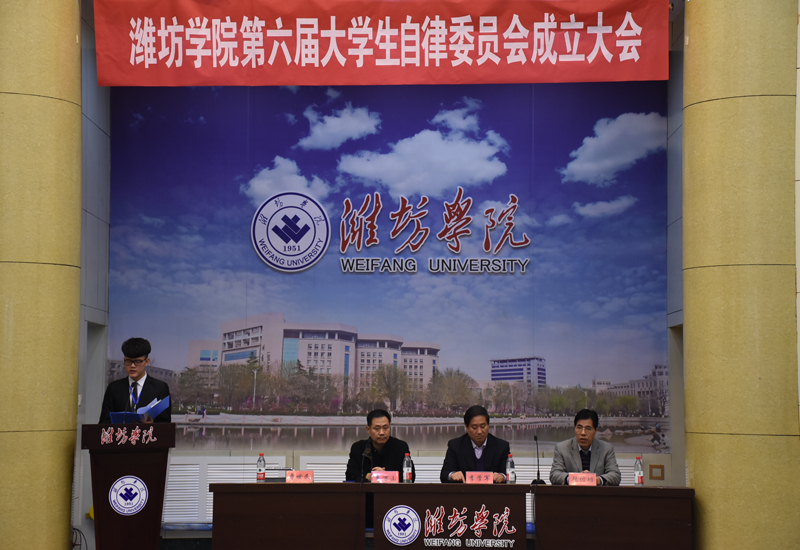 11月20日下午,潍坊学院第六届大学生自律委员会成立大会于行政楼一楼报告厅圆满举行。出席此次大会的有学生工作处处长李学军,副处长张付功,第五届大学生自律委主席及第六届大学生自律委员会全体成员。此次大会由朱万山担任主持人。