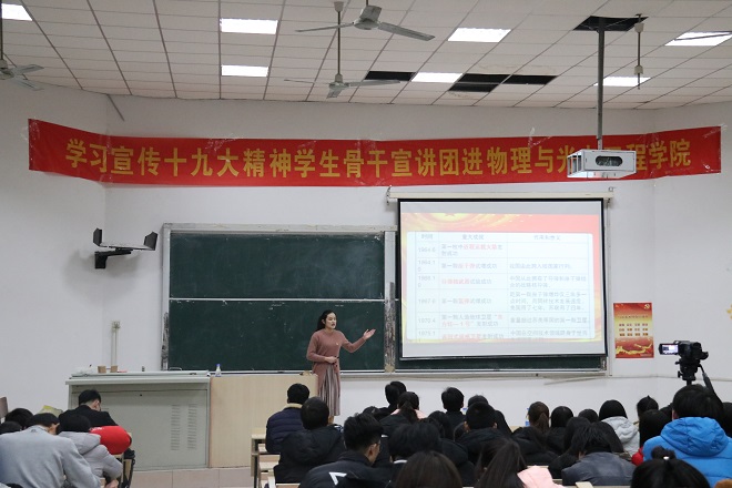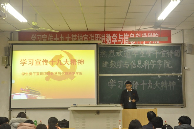 为进一步学习、宣传、贯彻党的十九大精神,发挥学生骨干的典型示范和引领作用,11月30日下午,学习宣传十九大精神学生骨干宣讲团一、二组全体成员分别走进、数学与信息科学学院、物理与光电工程学院进行宣讲。出席宣讲活动的领导有学生工作处副处长张付功、张增森,物理与光电工程学院党总支副书记贺志波等分别参加。我校学习宣传党的十九大精神学生骨干宣讲团走进各二级学院宣讲活动正式启动。