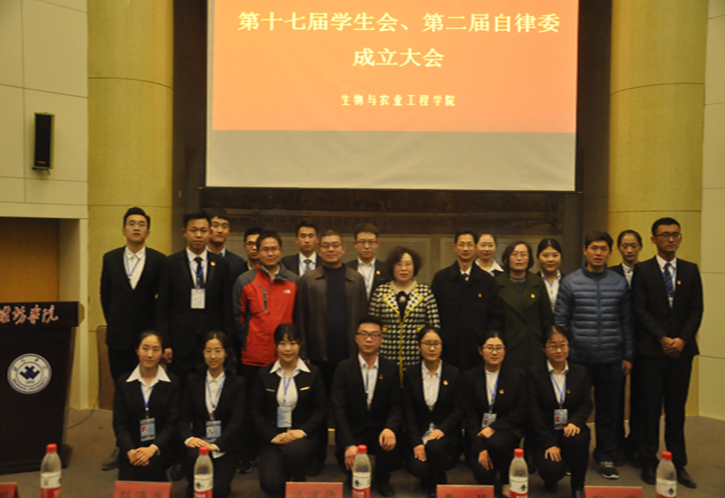 大会最后,老师与主席团成员合影留念。至此,大会圆满结束。荣誉属于过去,责任属于现在,成就属于未来。希望他们一起努力,在工作中磨励,在磨励中成长,为生物与农业工程学院的建设和发展做出更大的贡献。
