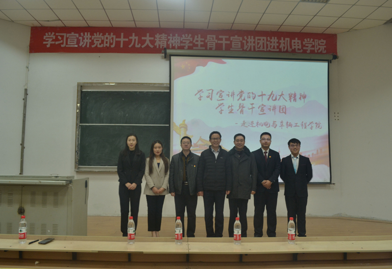 为进一步学习宣传党的十九大精神,发挥学生骨干的引领作用,12月5日下午,由学生工作处相关负责人边洪燕、郎斌、朱万山和钱雨带队的学生骨干宣讲团的四个小组分别走进化学化工与环境工程学院、信息与控制工程学院、生物与农业工程学院以及机电与车辆工程学院进行宣讲。