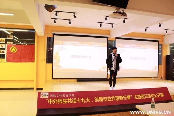 国际文化教育学院团委相关负责人对党的十九大精神进行解读,他希望中外同学把握机遇、携手并肩共同谱写中外友谊新篇章。与会师生还通过观看《新时代来啦》、《中国,我们一起加油!》等十九大宣传片,重温十八大以来砥砺奋进的五年里我国取得的历史性发展成就以及深刻品读十九大报告提出的中国特色社会主义新时代的深刻内涵。