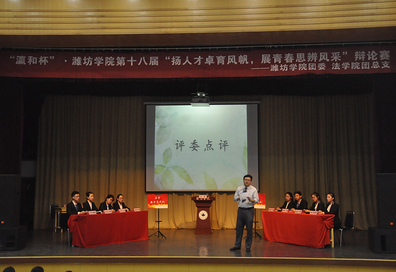 5月31日晚7:00,由共青团潍坊学院委员会、学生会主办,法学院团总支、学生会承办的“瀛和杯”潍坊学院第十八届大学生“扬人才卓育风帆·展青春思辨风采”辩论赛决赛在闻韶楼报告厅举行。出席本次比赛的嘉宾有瀛和律师事务机构潍坊分所主任王化冰先生,瀛和律师事务机构潍坊分所副主任李增福先生,法学院党总支副书记曹兴波6+,法学院综合办主任李乐强,法学院学生办公室主任王秀慧。担任本次比赛的评委有瀛和律师机构潍坊分所执行主任现在党总支书记周晓林先生,法学院团总支副书记李雅婷,法学院学生会主席徐洋,数学与信息科学学院学生会副主席赵姗,山东省模拟庭审大赛优秀诉讼代理人杜云宇。