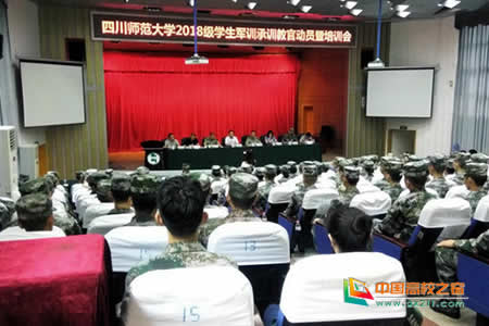 2018年9月6日下午,四川师范大学2018级学生军训承训教官动员暨培训会在狮子山校区学术报告厅举行。参加会议的有:四川师范大学军训工作领导小组组长、党委常委副校长张海东,锦江区委常委、区人民武装部政委焦亨建上校,锦江区人民武装部部长张大伟上校,四川邮电职业技术学院学生处处长简嘉,四川师范大学军训师政委、学生工作部武装部部长朱建军,军训师副政委、地理与资源科学学院党委副书记张晓宏、学校学生军训师、团主要负责人及2018级新生军训全体承训教官。会议由军训师师长、学生工作部武装部副部长李绍军主持。
