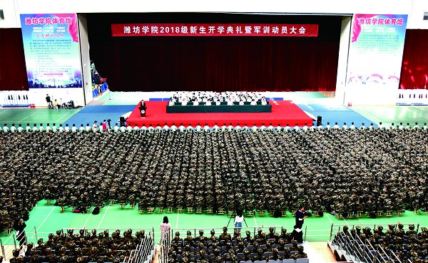 冯滨鲁代表全校师生员工,向来自全国29个省、市、自治区的6000余名新同学表示了祝贺和欢迎,向指导军训工作的部队首长和施训教官,表示敬意和感谢。他简要介绍了学校办学67年来取得的光辉业绩。他说,“潍坊学院”四个字承载的是一部艰苦奋斗、开拓奋进的创业史,锻造的是一支师德高尚、业务精湛的教师队伍,成就的是一批学业优良、勇于拼搏的优秀学子,更为重要的是她孕育了“和衷共济、艰苦奋斗、追求卓越”的潍院精神。
