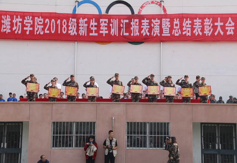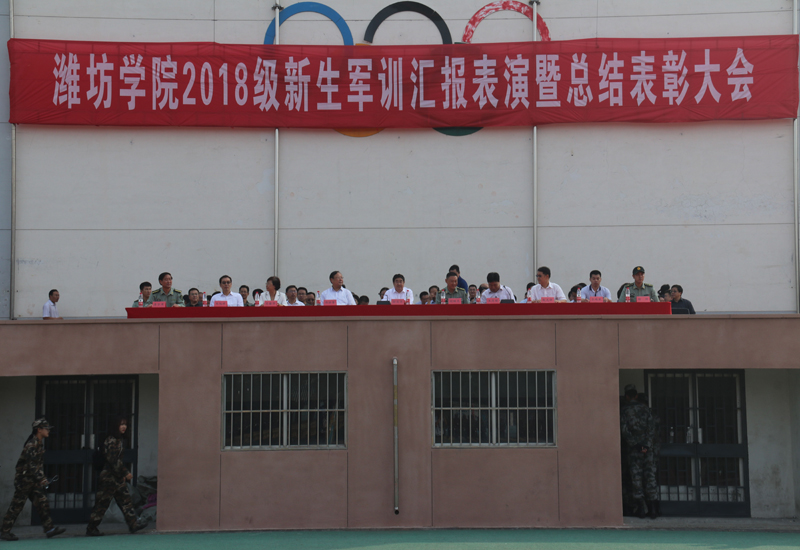秋风送爽,军歌飘扬。9月22日上午,我校2018级新生军训汇报表演暨总结表彰大会在田径场隆重举行,中国人民解放军第56部队副部队长刘坦克、潍坊市高新区人民武装部副部长齐瑞民、潍坊学院党委书记孙文亮、校长冯滨鲁、党委副书记王清明、纪委书记马茜华、副校长赵光强和王旭升、军训团团长邵帅少校、军训团政委李学军、学校各部门的主要负责人员和新生辅导员以及2018级全体新生参加了此次大会。党委副书记王清明主持大会。