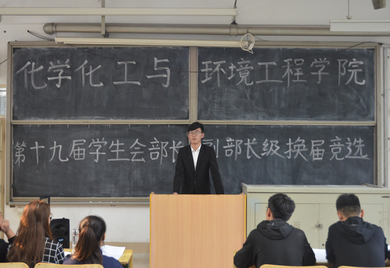 10月14日,化学化工与环境工程学院在人合楼8201教室举办了第19届学生会部长、副部长竞选活动。第18届学生会主席马超、第19届学生会主席赵志浩以及主席团成员参加活动并担任评委,2017级学生会竞选干事参加演讲。