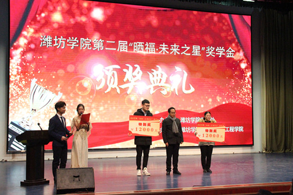 “晒福·未来之星”奖学金由82级校友曲金民出资设立,2016年6月举办了首届评选,产生了良好的效果和社会影响。今年,学校对《潍坊学院“晒福·未来之星”奖学金管理实施办法》进行了修订完善,并在10月份启动了第二届“晒福·未来之星”奖学金评选。根据新修订的评选办法,经过二级学院初评推荐、公众投票、校级终评答辩等环节,评选出了2个特别奖,10个全额奖,15个提名奖。