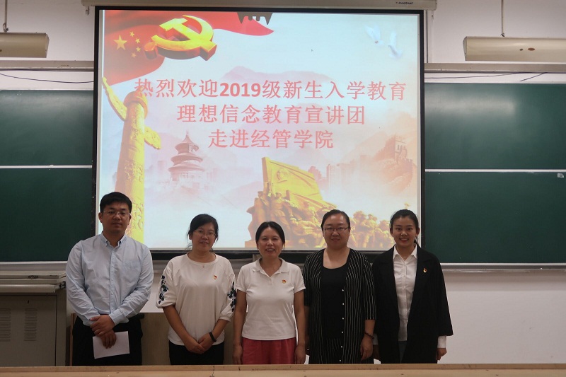 为了对2019级新生进行理想信念教育,经济管理学院于9月19日晚7点在致远楼412教室举办了2019级新生理想信念教育宣讲报告会。由学校理想信念教育宣讲团成员法学院学生工作办公室主任王秀慧老师、计算机工程学院辅导员刘峰老师、经济管理学院刘赛男同学组成宣讲队进行宣讲。校学生工作处副处长张增森、经济管理学院党总支副书记王海梅、团总支副书记于敏和2019级全体学生参加了此次活动。