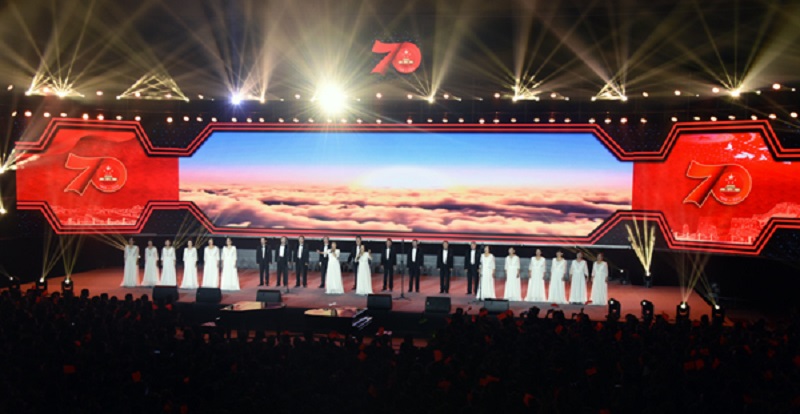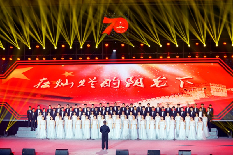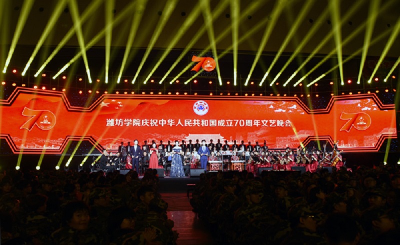 晚会共分为三个乐章,通过歌曲、舞蹈、朗诵等节目形式,运用灯光、音响等舞台效果,歌颂新中国70年翻天覆地的变化,抒发对祖国的挚爱之情,展现潍院师生与国家同呼吸、共命运,不忘初心、牢记使命,担当作为、砥砺奋进,推动高等教育事业发展的豪情壮志。