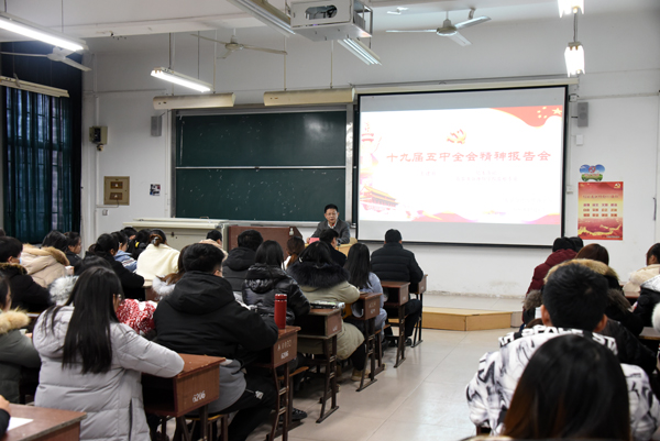 王书记从为什么学、学什么、怎么学三个方面紧紧围绕十九届五中全会审议通过的《中共中央关于制定国民经济和社会发展第十四个五年规划和二〇三五年远景目标的建议》进行了解读,主要对十九届五中全会召开的背景和重大意义、规划《建议》稿的形成过程、“十四五”时期经济社会发展的指导思想、遵循原则、主要目标以及规划《建议》的核心要义、习近平总书记强调的几个思维方法等内容作了详细阐释。最后要求师生们把学习、宣传、贯彻党的十九届五中全会精神作为当前和今后一个时期的重要政治任务,按照学校统一部署和要求,紧密结合工作实际,读原著学原文悟原理;明确青年责任、勇担历史使命;努力学习科学知识,培养创新创造能力;采取多样化学习方式,学深悟透全会精神。面对新发展,踏上新征程,为开创学校高水平应用型大学建设新局面做出新的更大贡献!