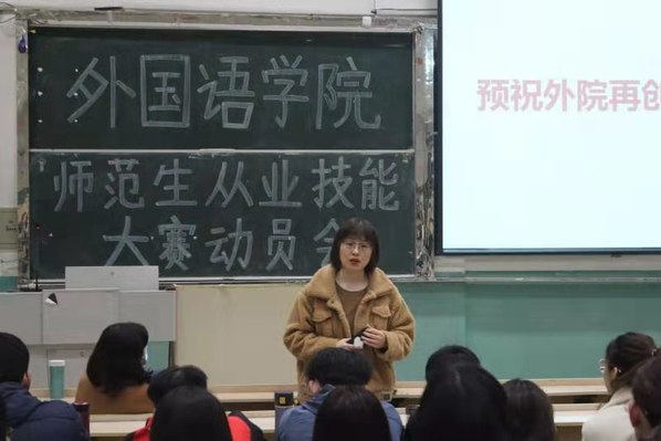 2021年3月16日下午7时,外国语学院在至善楼3136教室举办师范生从业技能大赛动员会,李艳华、安然、李冬燕作为指导老师主持本次会议,18级和20级专升本英语专业学生参加了大会。