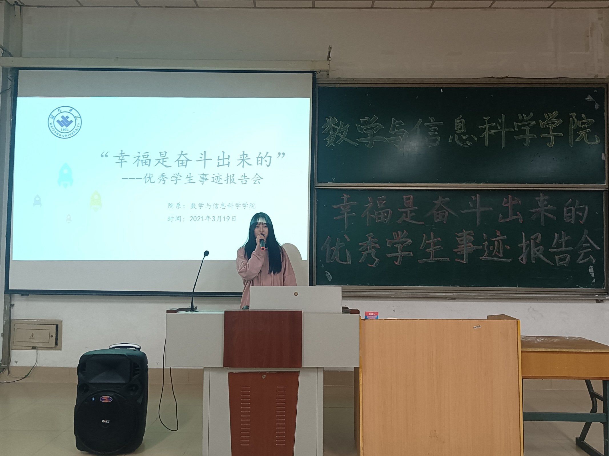 为加强学院学风建设,提高同学们对学习的积极性,树立正确的学习目标,2021年3月19日和3月21日晚,数学与信息科学学院于人合楼8122教室开展以“幸福是奋斗出来的”为主题的优秀学生事迹报告会,由数学学院王颖、朱文琦、耿超、李玉莹和张力晨五位优秀学生代表作宣讲报告,2019级、2020级的全体学生参加。