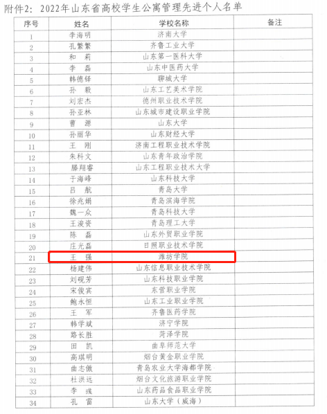 近日,山东省学校后勤协会、高校公寓管理分会印发了《关于公布2022年山东省高校学生公寓管理先进单位和先进个人的通知》,我校获评2022年山东省高校学生公寓管理先进单位,公寓管理中心党支部书记王强获评2022年山东省高校学生公寓管理先进个人,成为省内唯一同时获得两项殊荣的高校。