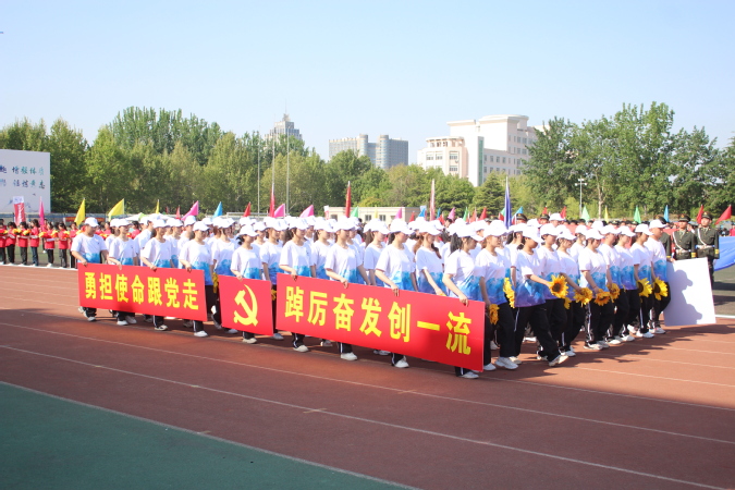 运动场上,各二级学院的队伍步调一致、井然有序。外国语学院的学生身着白色的制服,头戴白色帽子,前排同学手持向日葵和荷花,大家面露微笑,大声宣读着外院的口号:“学好外国语,做好中国人”,同学们昂首挺胸的姿态、朝气蓬勃的精神和整齐划一的步伐展现了外院学子拼搏的活力与必胜的决心。开幕式的最终环节是文体表演,一个个精彩绝伦的表演赢得了满堂喝彩。各级学院通过表演节目,展现了不一样的青春风采。入场仪式结束,全体师生起立,齐声高唱庄严的国歌。随后,主席团成员潍坊学院党委副书记徐梅致开幕词,运动员代表和裁判员代表庄严宣誓。开幕式最后,主席团成员潍坊学院党委书记李东宣布“潍坊学院第20届校运动会正式开幕”。
