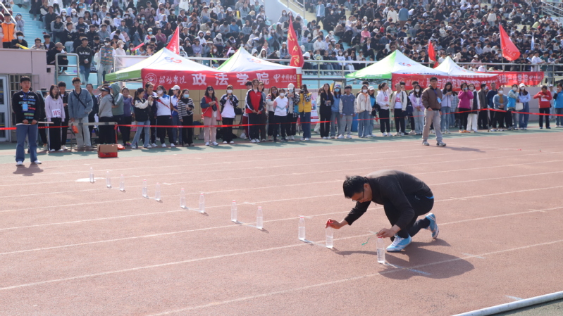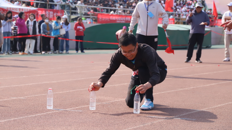 比赛前老师们紧握瓶盖进行热身运动,踢腿、转动脚腕、小跑步,他们脸上挂着自信的笑容等待着枪声的响起。他们双脚站在起跑线上,双手放在腰部,让自己可以尽快加速。他们肩膀放松,目视前方,眼神坚定聚精会神,不再有任何杂念。比赛正式开始,老师们手握瓶盖奋力跑向水瓶,稳中求胜用最快的速度拧稳瓶盖,这次考验的是他们临危不乱的心态、动手能力和起跑的反应能力,瓶盖拧好后,他们第一时间提起瓶子快马加鞭进行冲刺,学院两位参赛老师犹如离弦的箭一般在赛场上驰骋冲刺过终点,观众台上传来一阵阵掌声与呐喊,通过两位老师的不懈努力,最终取得了优异的成绩,其中,韩立坤老师拿到了此次比赛的第一名。