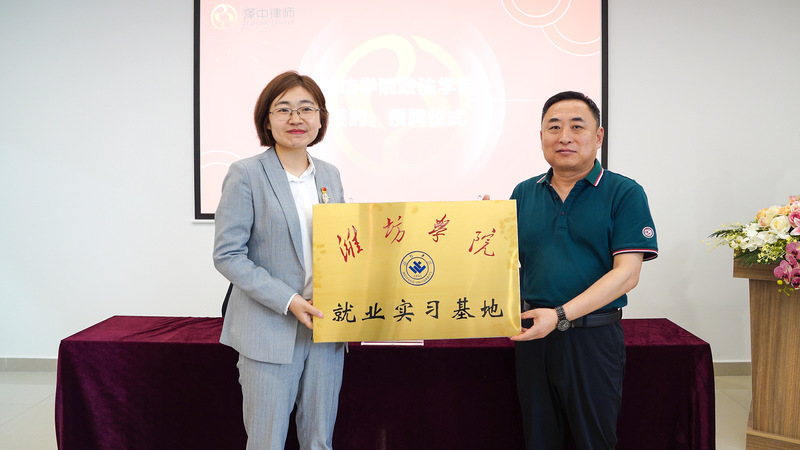 第二阶段为潍坊学院、泽中体系与山东泽中律师事务所合作签约及授牌仪式。首先曹兴波书记致辞,曹书记表达了对山东泽中律师事务所成立的衷心祝贺,并对泽中律所未来的发展致以美好的祝愿和殷切希望,希望泽中律所能够秉承初心,一如既往地为维护当事人的合法权益和捍卫社会公平正义奋斗。随后,院长苗金春、律所创始合伙人郭圣凯在会议室进行了合作签约。签约后,苗院长、曹书记、杜院长依次为潍坊学院教学实践基地、潍坊学院就业实习基地、泽中思源奖学金授牌。