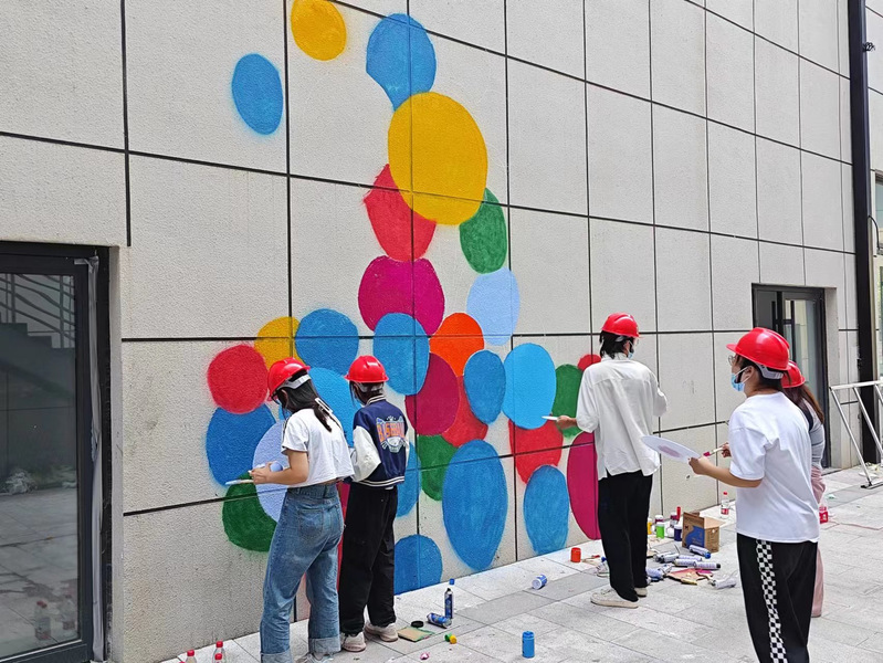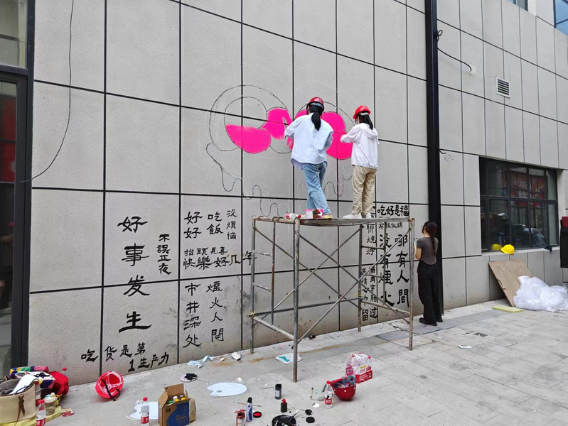 绘画小组成员们在负责人的带领下分组、有序地开展墙绘活动,成员们充分利用墙体设计了墙绘作品,以社区墙为画卷,搭架作画精心设计;以丙烯、画笔、毛笔、喷漆为材料,一笔一画细心勾勒,打造当地一处新景观。他们发挥着专业特长,把心中之意化为笔下之文,整体画面包含有青春、美食、文明等元素,这些墙绘作品的素材来源于周边生活,取材于周边环境,是群众身边的艺术。既美化了社区环境,贴合了时代感,更传递了文明的力量,带动了更多的人去欣赏艺术,发现美术艺术的美。