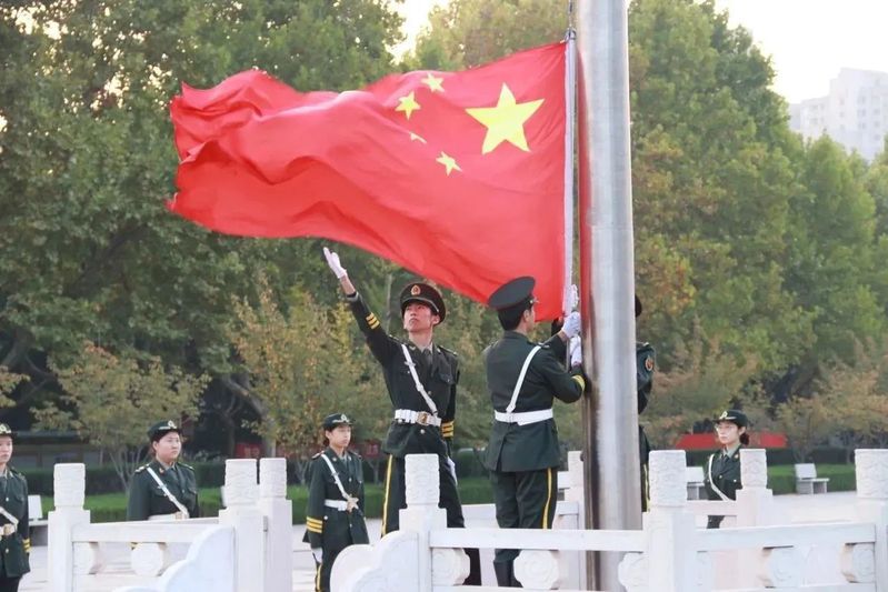 国旗护卫队的旗手们着装整齐,迈着矫健的步伐,护着鲜艳的五星红旗走向升旗台。伴着《义勇军进行曲》响起,鲜艳夺目的五星红旗冉冉升起,国旗飘扬,振奋人心。全体师生庄严肃立,怀着激动的心情和崇高的敬意向五星红旗行注目礼。
