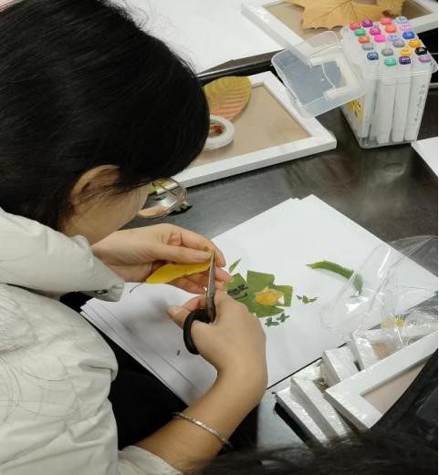 在活动进行前,心理部干事在校园内收集了各式各样的落叶并清洗干净。在活动进行中,同学们根据自己的兴趣和爱好随机配对组合,根据叶子的形状与颜色,通过剪、粘、画等方式,设计出了一幅幅别出心裁、不拘一格的树叶贴画。有的小组将树叶裁剪出不同的形状并粘贴在纸上,制作出了可爱的小狮子;有的小组发挥自己丰富的想象力,直接在树叶上作画,制作了一朵荷花;还有的小组在作品上添加背景、文字等简单的装饰,制作了一幅别具风味的江边独钓图。在作品设计完成后,各小组依次分享了自己的创作灵感和思路,大家用心创造的佳作成为秋日最美的表达。最后,同学们把贴画放进相框,进行合影留念,为大学生活留下美好的瞬间
