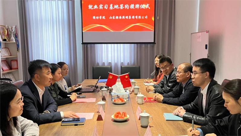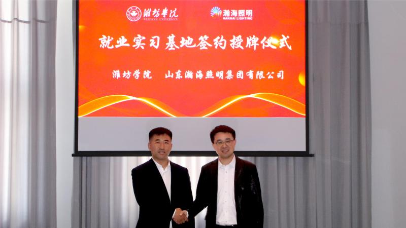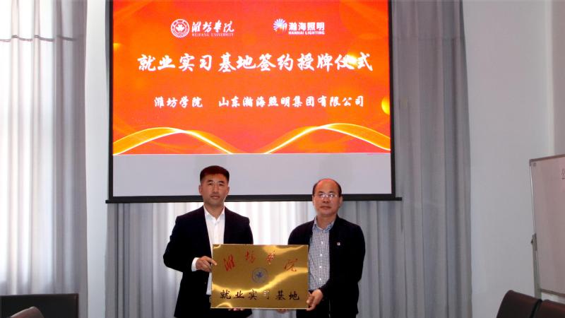 王波与韩军海分别代表校企双方签署了就业实习基地建设及相关教科研合作协议,任怀坤为山东瀚海照明集团有限公司颁授“潍坊学院就业实习基地”牌匾。