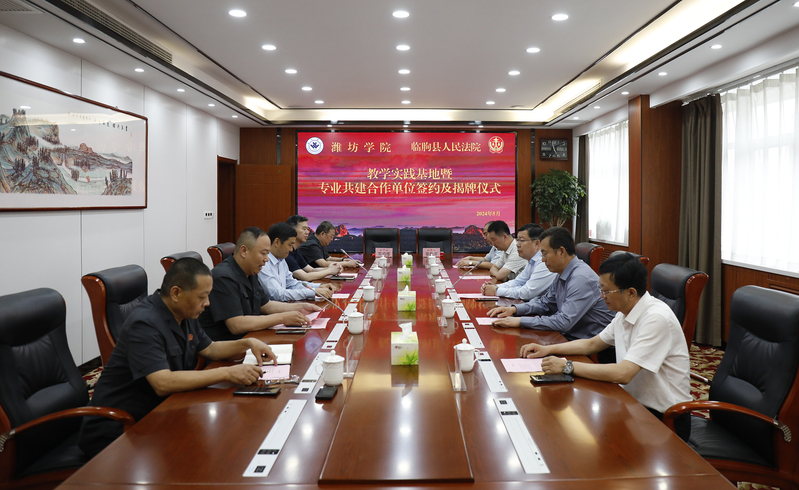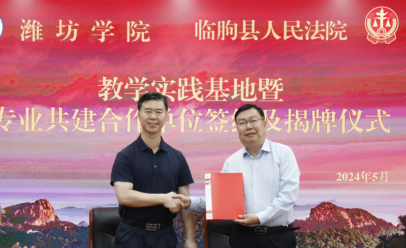 为促进法学教育与司法实践深度融合,实现高等院校与司法机关的资源共享与优势互补,5月21日,我校与临朐县人民法院“教学实践基地”暨“专业共建合作单位”签约及揭牌仪式在临朐法院举行。潍坊学院党委委员、副校长王成端,临朐县人大常委会党组成员、副主任马建平,临朐县法院党组书记、院长马瑛杰出席签约仪式并讲话。