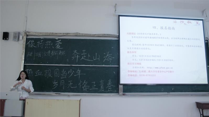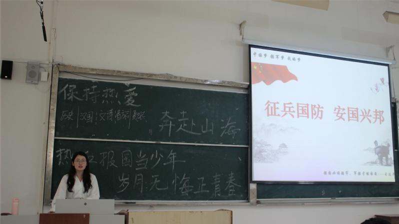 为鼓励和引导青年学生积极响应祖国号召,投身军营、献身国防,激发大学生从军报国的理想追求,5月23日下午,文史学院(文化与旅游学院)于6101开展大学生应征入伍政策宣讲会。国防教育中心副主任孙婷婷、文史学院毕业班辅导员、全体毕业生参加宣讲会。