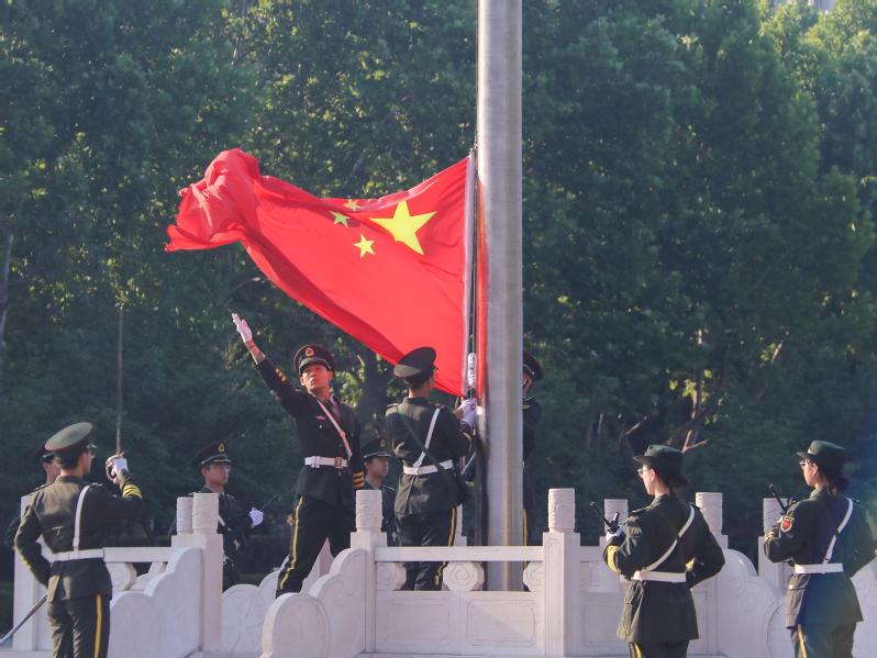 早上6点30分,升国旗主题教育活动正式开始。国旗护卫队队员迈着铿锵有力的步伐,护卫五星红旗入场,随着《义勇军进行曲》音乐的响起,全体师生满怀敬意地注视着鲜艳的五星红旗冉冉升起,随风飘扬。