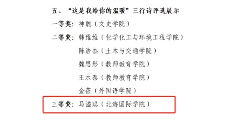 近日,由潍坊学院学生工作处主办的第八届大学生心理健康节系列活动圆满结束,北海国际学院推荐的“不‘欺’而遇,约‘绘’自然”特色心理活动获得三等奖,辅导员邓海云老师的心理辅导案例获得一等奖,2023级工商企业管理1班学生宋皓源组织的心理健康教育主题班会获得二等奖、2022级工商企业管理1班学生马溢聪创作的“这是我给你的温暖”三行诗作品获得三等奖。