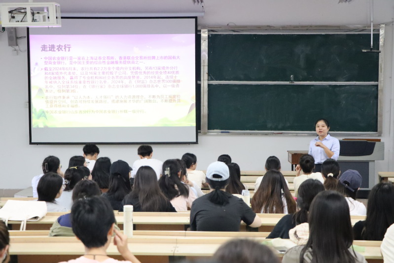 在活动中,负责人详细介绍了中国农业银行的成立背景、发展历程、企业文化以及招聘和培养人才的标准,并通过自身的工作经历由点及面地向同学们讲解了公司工作职位、工资薪酬等方面情况。