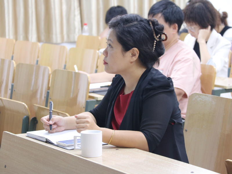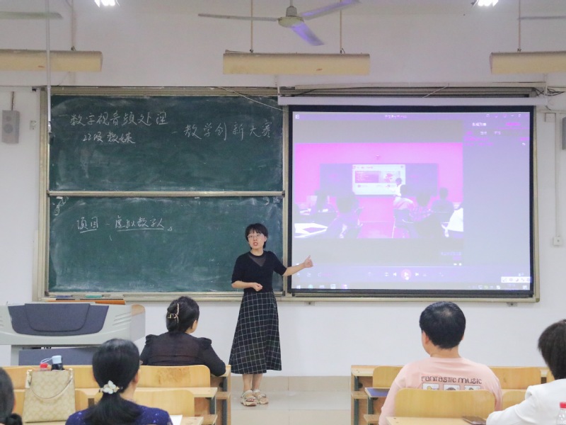 课上,董辉对青教赛的参赛条件、比赛大纲、准备工作等相关内容进行介绍。当提到前期如何充分准备比赛时,董辉表示,创新报告的撰写以及教学视频的制作讲求有深度、有广度,而答辩则更注重平时的积累量。随后,董辉以“虚拟数字人”为例,结合获奖教学视频,向其他老师分享自己的参赛经验。此外,董辉特别强调了过程反馈机制的重要性,她表示,比赛中要进行师生互馈,及时调整自己的教学策略,将问题落到实处,提升整体的教学质量。