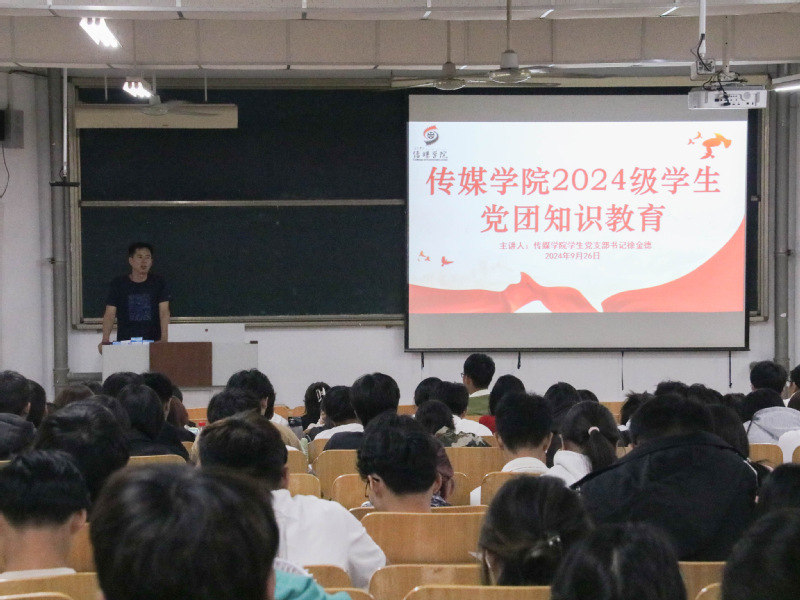 为帮助新生们更好地适应大学生活,引导同学们树立正确的世界观、人生观和价值观,激发爱国热情和使命感,9月26日晚,传媒学院于天一楼7217教室开展党团知识教育课。本次活动由2024级新生辅导员徐金德主讲,2024级全体新生参加。