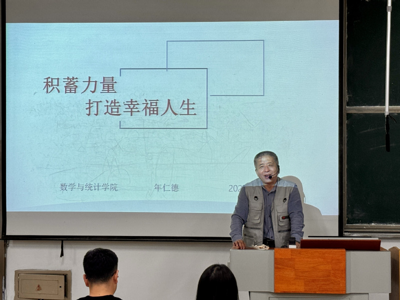 为庆祝中华人民共和国成立75周年,迎接学校建校73周年,10月15日晚,数学与统计学院邀请退休教师年仁德教授,从关爱青年学生成长成才角度出发,举办以“积蓄力量,打造幸福人生”为主题的报告会。数学与统计学院党委副书记杨颂出席,团委副书记宋志鹏主持,2024级新生代表参加活动。