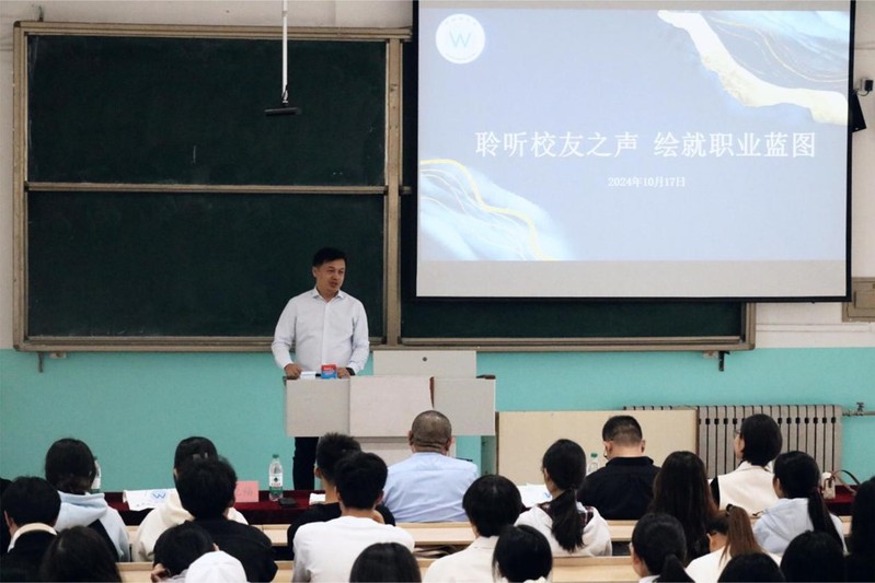 四时俱可喜,最好新秋时。为了帮助在校学生提供职业发展指导和创新创业启发,并加强校友与学院的联系,更好的促进校友之间的交流与合作,10月17日下午,外国语学院举办了以“传承与创新:校友引领,共筑外院未来”为主题的校友讲座活动。外国语学院1983级校友于波、2005级校友李丰旭、校友赵纪福、2006级校友陈晓莉特邀出席本次活动。外国语学院党委书记王海梅、院长张学祥、党委副书记张晓丽、副院长王珂及2024级全体学生参加了本次讲座。