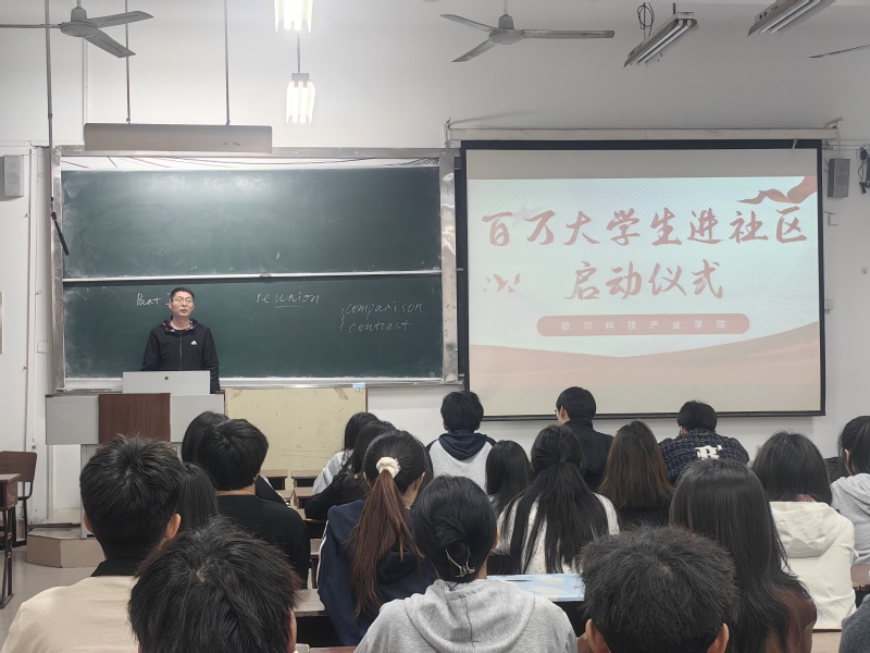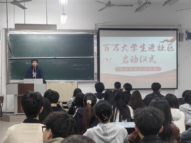 为持续推进百万大学生进社区活动,充分发挥大学生的青春力量,歌尔科技产业学院于10 月 15日在致远楼6206教室开展百万大学生进社区启动仪式,活动由团委副书记邓豪主持开展 ,2023级学生干部出席会议。