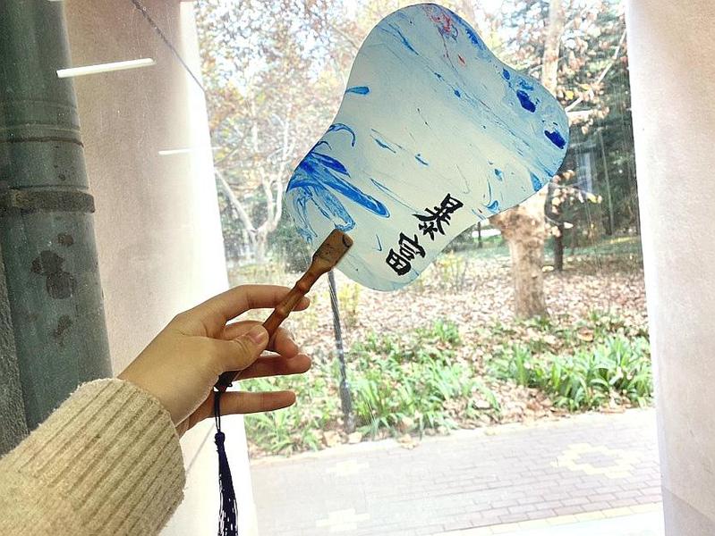 活动现场,干事赵苡慧为大家介绍了漆扇的历史渊源、艺术特点和文化价值,让同学们对漆扇有初步的了解。随后,工作人员现场示范漆扇的制作过程,配色、稀释、调漆、沉扇......在干事们的帮助指导下,大家开始艺术创作之旅。首先精心挑选扇面和颜料,发挥自己的想象力和创造力,将空白的扇子轻缓地沉入染料池,摇动、旋转、轻推扇柄,创造出一幅幅精妙异常的扇面。当漆扇的雏形初现,大家又纷纷化身“书法家”,用手中的毛笔,在扇面上书写出自己心中的“图”。一个个独一无二、颜色各异、色彩斑斓的漆扇就在同学们的手中诞生。