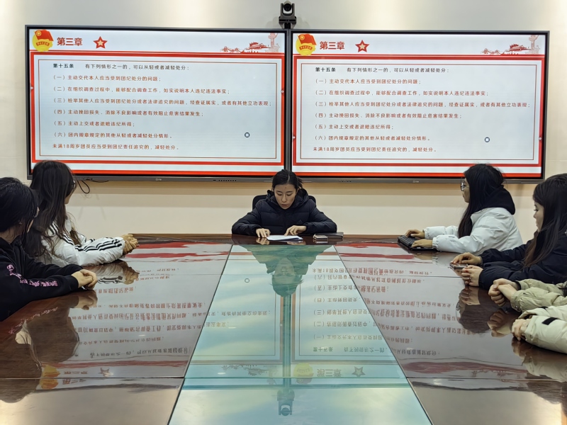 为深入学习贯彻习近平新时代中国特色社会主义思想,进一步严肃团的纪律,提升团员纪律意识和法治素养,化学化工与环境工程学院团委负责人赵文婷于2024年11月29日下午4点在人合楼8213会议室开展了《中国共产主义青年团纪律处分条例(试行)》主题团课学习活动,学院团支部书记代表以及新发展团员参与此次团课学习。